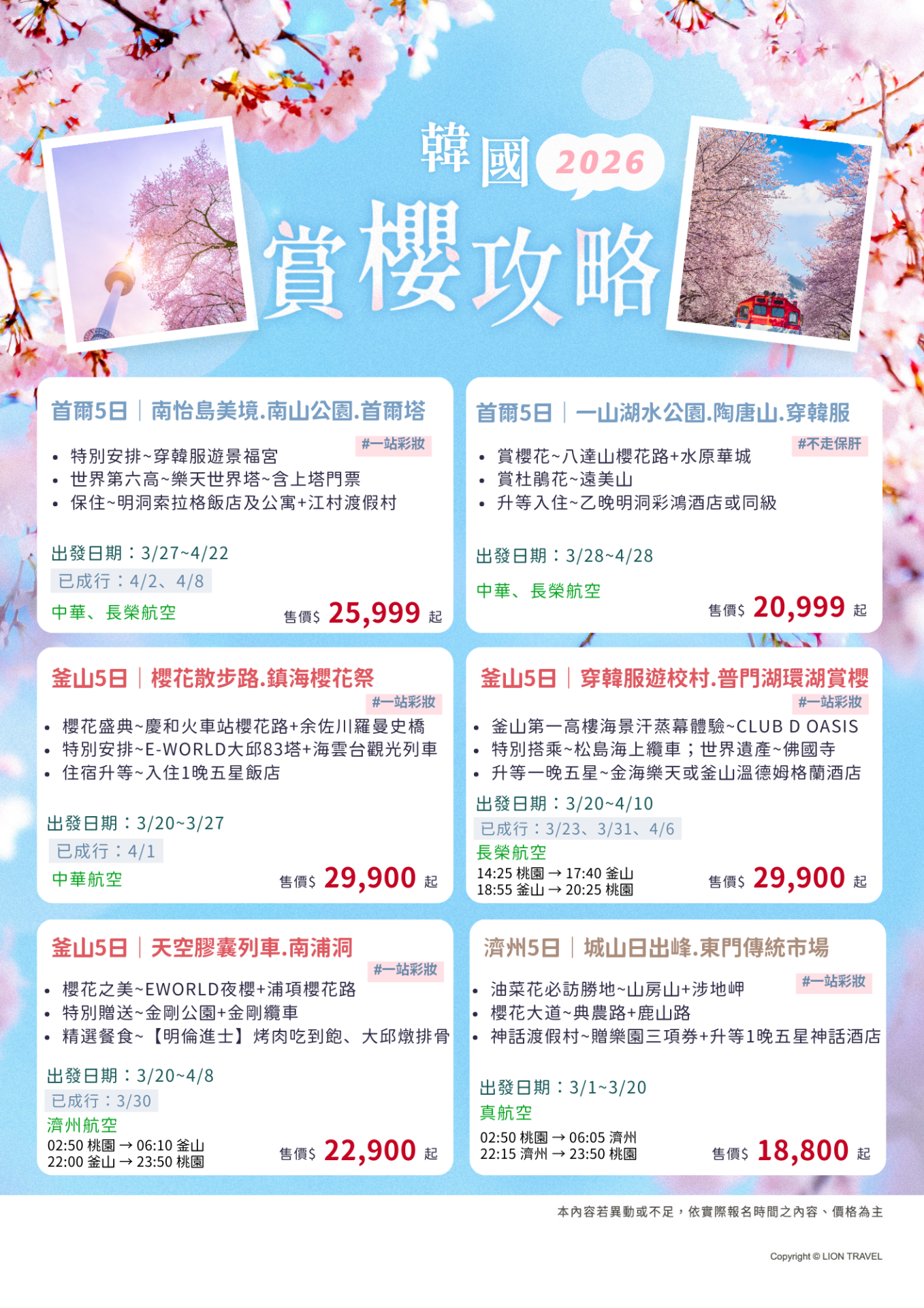 出發日期: 2026/4/15、17、18、19、21、24、25、30