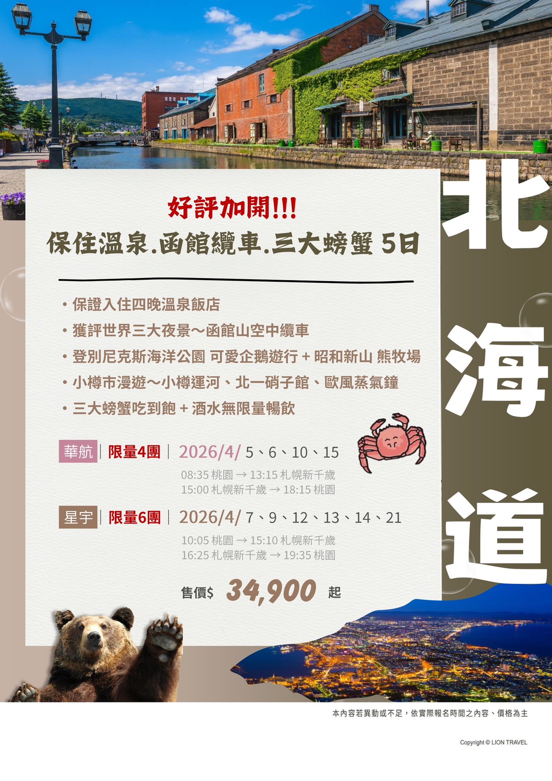 限量搶北海道旅遊|函館纜車.企鵝遊行.小樽漫遊.熊牧場.OUTLET.三大螃蟹溫泉五日|保住四晚溫泉